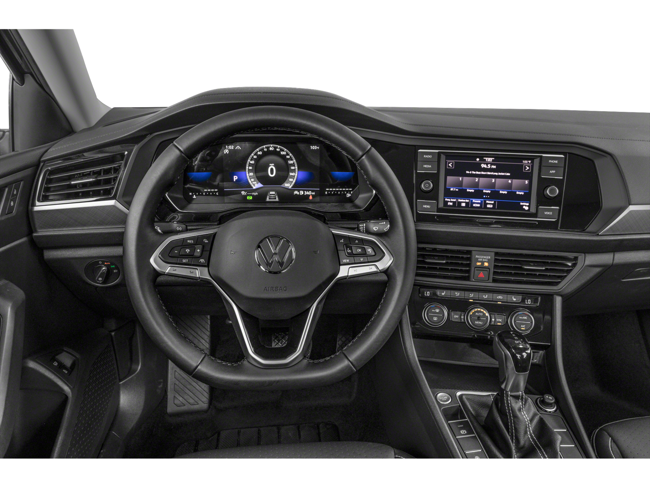 This 2023 Pyrite Silver Metallic Volkswagen Jetta 1.5T SE FWD is well equipped and includes these features and benefits: Jetta 1.5T SE, FWD, Titan Black w/V-Tex Leatherette Seat Trim, 4 Speakers, 4-Wheel Disc Brakes, ABS brakes, Active Blind Spot Monitor, Air Conditioning, Alloy wheels, AM/FM radio, Auto-dimming Rear-View mirror, Automatic temperature control, Brake assist, Bumpers: body-color, Delay-off headlights, Driver door bin, Driver vanity mirror, Dual front impact airbags, Dual front side impact airbags, Electronic Stability Control, Emergency communication system: VW Car-Net Safe & Secure 5-year, Exterior Parking Camera Rear, Front anti-roll bar, Front Bucket Seats, Front Center Armrest, Front dual zone A/C, Front wheel independent suspension, Fully automatic headlights, Heated door mirrors, Heated Front Comfort Sport Seats, Heated front seats, Illuminated entry, Leather Shift Knob, Low tire pressure warning, Occupant sensing airbag, Outside temperature display, Overhead airbag, Overhead console, Panic alarm, Passenger door bin, Passenger vanity mirror, Power door mirrors, Power driver seat, Power steering, Power windows, Radio data system, Radio: MIB3 Composition Color w/6.5 Touchscreen, Rain sensing wipers, Rear anti-roll bar, Rear reading lights, Rear seat center armrest, Rear window defroster, Remote keyless entry, Speed control, Speed-sensing steering, Split folding rear seat, Steering wheel mounted audio controls, Tachometer, Telescoping steering wheel, Tilt steering wheel, Traction control, Trip computer, V-Tex Leatherette Seat Trim, Variably intermittent wipers, and Wheels: 17 Twin 5-Spoke Silver Painted Alloy. Jetta 1.5T SE, FWD, Titan Black w/V-Tex Leatherette Seat Trim.